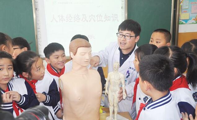 图为海慈医疗集团针推康复科医师带领同学们认识人体经络及穴位。
